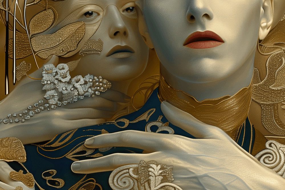 In deze portretten is de invloed van Klimt duidelijk zichtbaar in de manier waarop de menselijke vormen en gezichten zijn weergegeven. De sierlijke contouren, de expressieve houdingen en de emotionele diepgang van de figuren roepen een gevoel van mysterie en intrige op, terwijl de rijkdom van de decoratieve elementen een gevoel van overvloed en verfijning toevoegt.