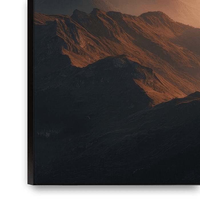 This vast mountain landscape is carried by a warm, low light that spreads through the valleys like a gentle breath. The mountain ranges lie before each other in layered depths, their contours fading into mist and golden sky. Shadows linger quietly on their flanks, while light opens and softens the space. There is no movement, just a…