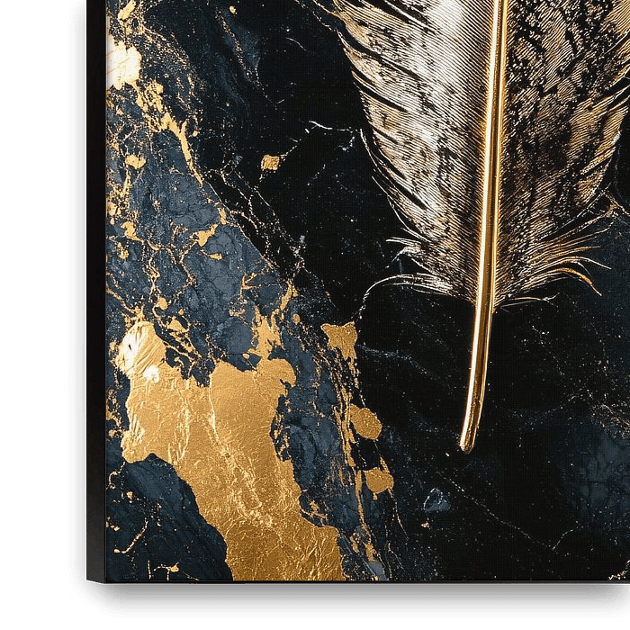 This stunning design shows a luxurious gold feather set against a black marble background, infused with breathtaking golden veins. The combination of the shiny gold and the deep black of the marble creates a striking contrast that exudes elegance and style. This artwork is perfect for modern interiors where minimalism meets luxury. The…