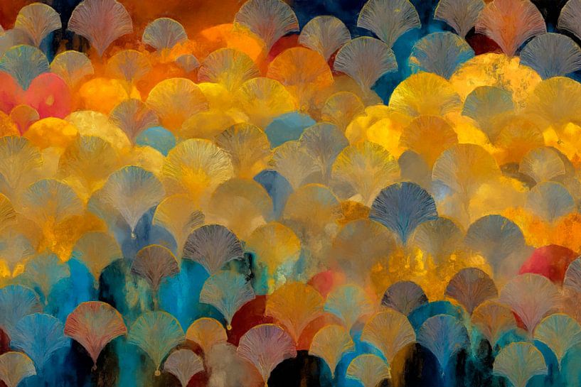 An abstract work composed of repeating, fan-shaped ginkgo leaves in gold, ochre, blue and red. The leaves lie in layers upon one another and fill the canvas from edge to edge, with no clear beginning or end. The organic forms subtly evoke nature and convey a sense of growth and movement.