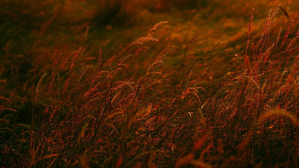 A field of tall grass is illuminated by the warm, low sunlight of the evening. The culms catch the golden light, giving the landscape a calm and atmospheric look. The surroundings look quiet and deserted, with deep shadows and a warm glow.