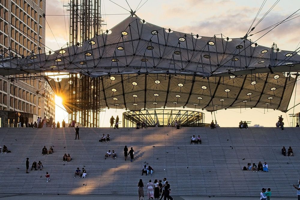 Sunset in the central square with the Arche in the modern business centre La Defense in Courbevoie, Paris.