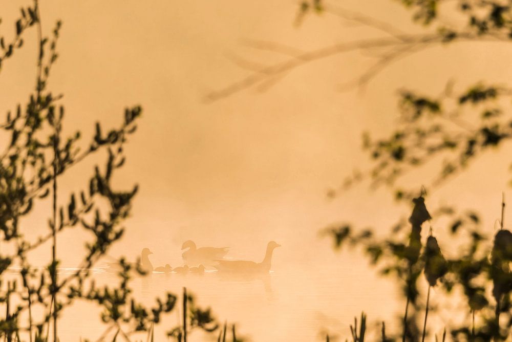 Ducks with young at sunrise, during the golden hour, in National Park De Groote Peel on the border of the provinces Noord-Brabant and Limburg in the Netherlands.