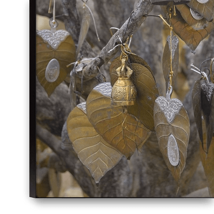 At a temple in Chiang Mai, golden leaves and tiny metal bells hang gently from a sacred tree. Each leaf features delicate patterns that shine in the warm light. The bells move almost inaudibly in the wind, like a hushed reminder of peace, devotion and impermanence. A sculpture that invites you to pause and really look.