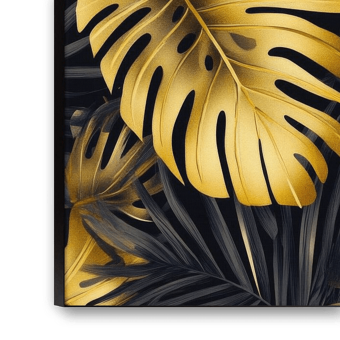 In a play of light and shadow, magnificent leaves unfurl in precious gold, dancing gracefully against a deep black background. The shiny contours form a fascinating contrast to the dark, mysterious shapes, reminiscent of tropical nights and luxurious oases. A harmonious symphony of elegance and natural beauty.