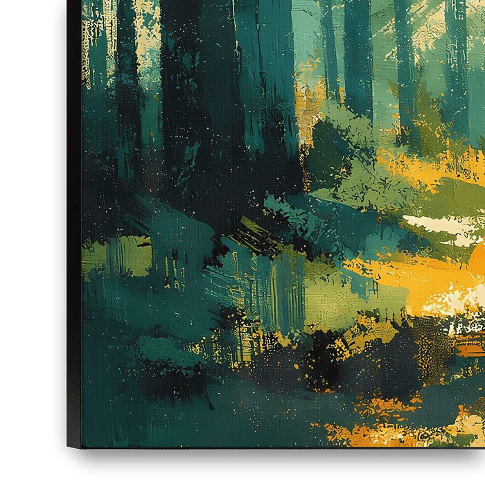An atmospheric, nature-inspired work of art that captures the magic of a forest bathed in warm sunlight. Dark tree trunks and deep green crowns frame the scene, whilst golden rays of light break through the canopy and illuminate the forest floor in vibrant shades of green and amber. The dynamic, textured brushstrokes create depth,…