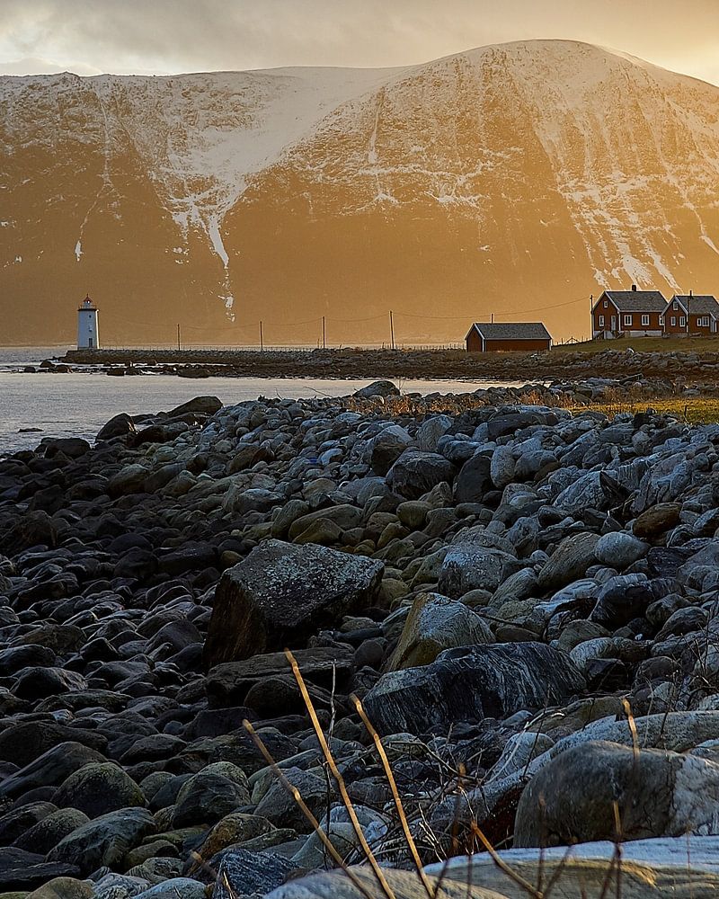 About "Golden light of the setting sun above the Høgstein lighthouse, Godøy, Norway"
