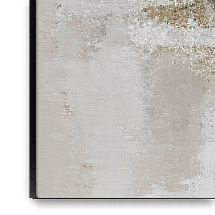 This abstract work exudes a serene calm, composed of soft tones of beige (colour), white and accents of gold. The composition seems to hover between sky and earth, as if patches of fog mix with reflections on a water surface. The horizontal layering in the centre suggests a landscape, but remains deliberately vague - like a memory that…