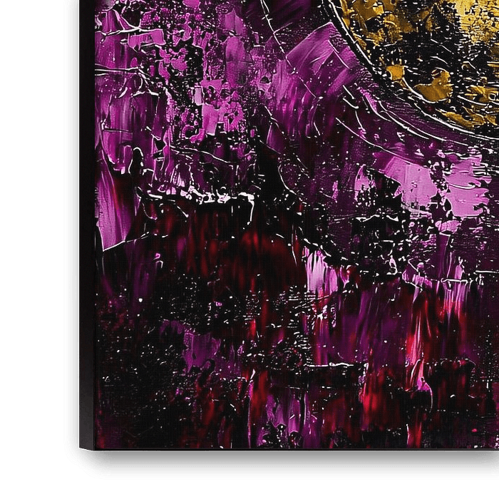 A sophisticated abstract artwork that combines strength and elegance. This design shows a striking golden circle reminiscent of a moon, surrounded by dynamic purple and black tones. The whole piece exudes energy and luxury, while the subtle geometric patterns in the design add a modern touch. Ideal as a statement piece in a living room or office space, this artwork suits contemporary decor and adds depth and character to any space. Perfect for lovers of abstract and modern art looking for something unique.