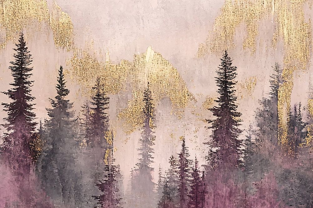 This beautiful artwork combines the power of nature with a touch of abstraction. A fairytale-like combination of golden mountains and a mysterious purple forest setting creates a unique atmosphere. The soft mist between the trees and mountains adds a serene and magical feel, perfect for modern decor. This design brings tranquillity and elegance to any space, be it a living room, office or bedroom. It is a real eye-catcher that evokes both warmth and a sense of adventure.