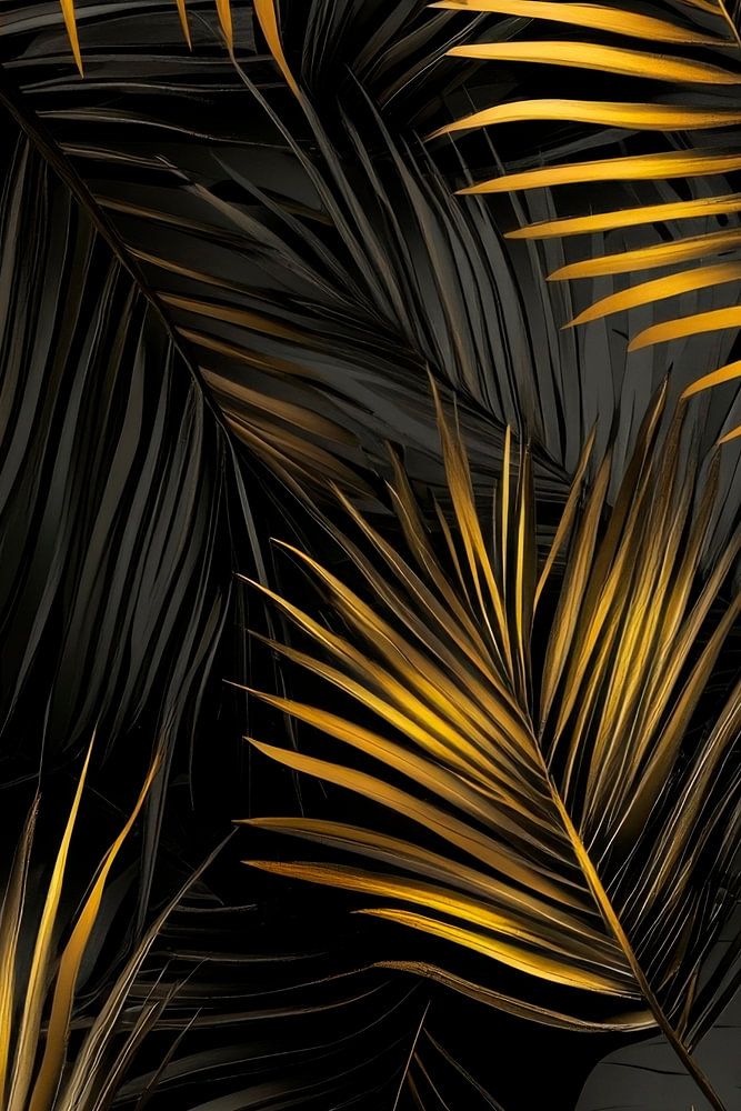 A lush symphony of elegantly curved palm leaves unfolds against a deep black background. Golden accents add a touch of luxury and exoticism to the foliage, while the sleek lines dance harmoniously together. This composition invites you to immerse yourself in a tropical oasis of style and sophistication.