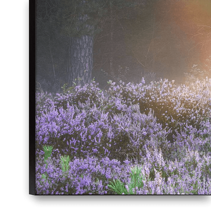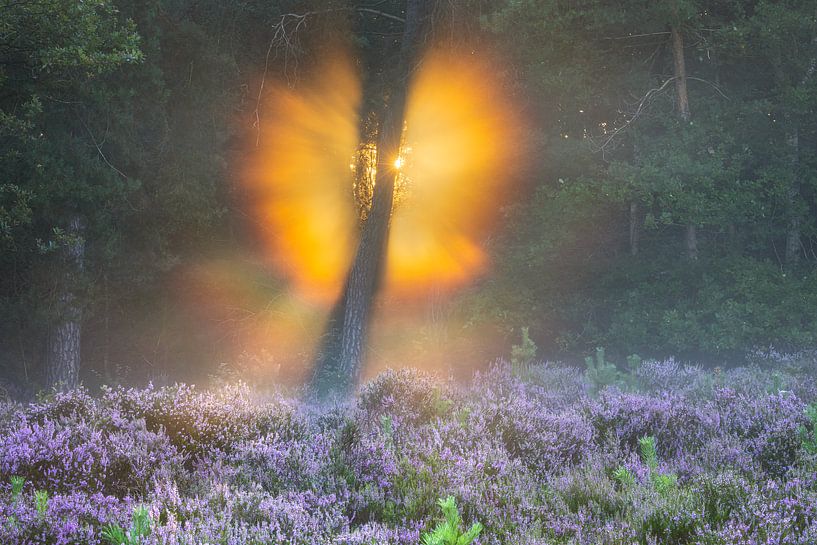 What a magical moment when the sun emerges from behind a tree at the edge of a heathland. The sunlight sparkles in all directions. The light mist hanging above the heath reveals beautifully coloured rays in all the colours of the rainbow. Around the sun, a bright circle of light can be seen in golden tones. Close to the ground, a second…
