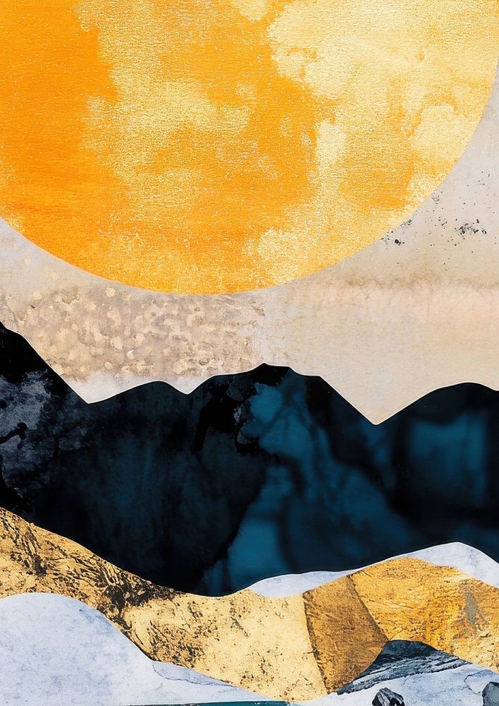 Discover this abstract illustration depicting mountains and the sea in the style of an ink drawing. The black background provides a dramatic contrast to the golden sun and moon. The bright yellow colours create an eye-catching effect reminiscent of gold foil.