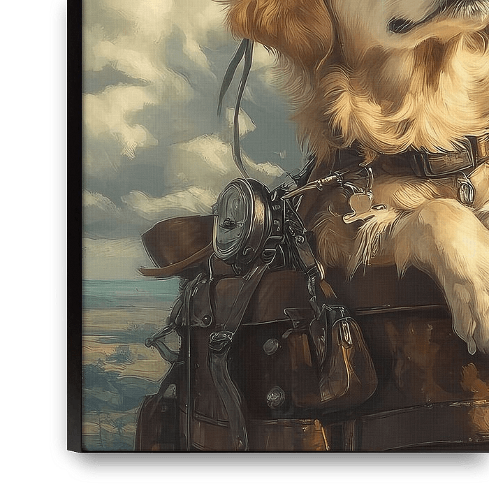 This cheerful artwork shows tough Golden Retrievers in a surrealistic style.