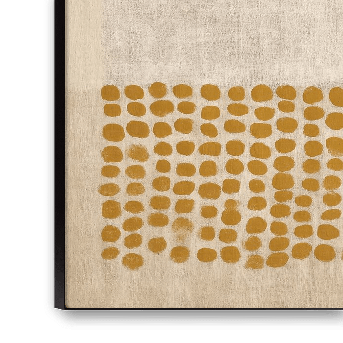 A serene abstract composition built from soft layers of texture, ochre tones and rhythmic dots. The combination of horizontal planes and manual patterns creates a sense of balance and warm simplicity. Perfect for an interior that exudes tranquillity, softness and natural harmony.