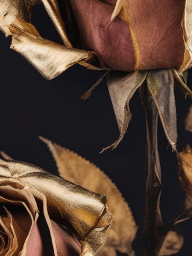 The picture shows two wilted, golden roses with dry, curled petals and brown, wilted leaves on the stems. The background is dark, probably black or deep blue, creating a dramatic and melancholic contrast with the golden hues of the roses. The whole scene has an artistic, almost surreal look, possibly symbolising impermanence or beauty in decline.