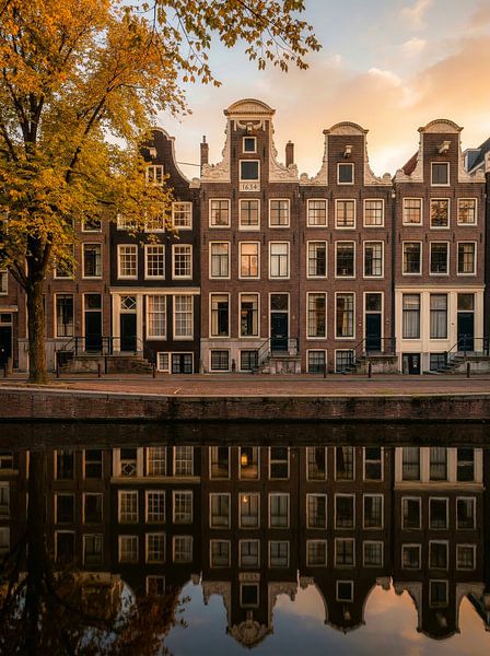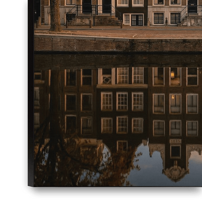 A row of characteristic canal-side houses stands majestically along the water, bathed in warm evening light. The façades, each with their own unique shape and details, tell tales of a rich history. The soft glow of the setting sun gives the bricks a golden hue, whilst the sky slowly shifts into tranquil pastel colours.