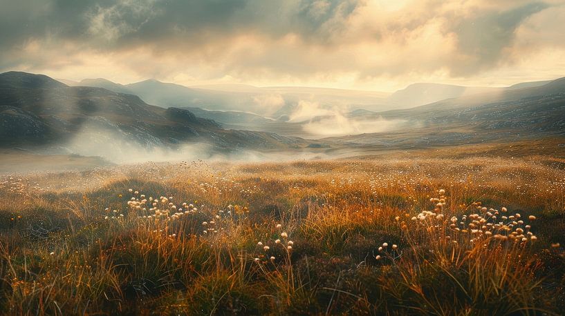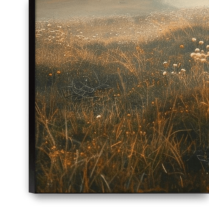 A vast field unfolds beneath a gentle sky, where the light glides over the earth like a warm breath. A veil of mist hangs amongst the fine grasses and delicate flowers, softening the landscape and lending it depth. In the distance, hills fade into a haze of light and shadow, whilst shades of ochre and gold carry the moment. Everything…
