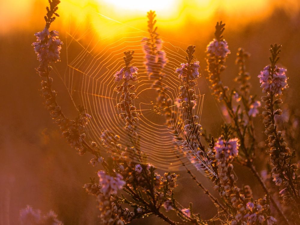 On a very early morning in the Brunssummerheide, at one moment there was a beautiful golden sky. Everything around you was colored gold , this gave a nice contrast to the newly blooming purple heather. The cobwebs in the heather were nicely visible because of the low sun. In this photo I managed to capture the moment beautifully.