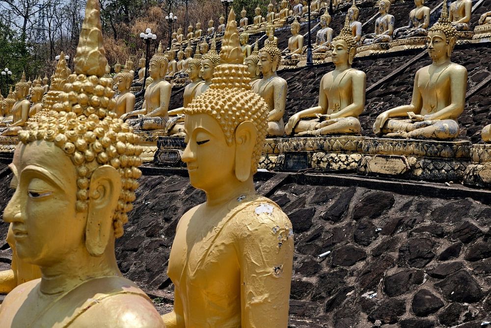 The place is bathed in light, highlighting the brilliance of the gilding, while the backdrop of dry nature and sparse trees is a reminder of the heat of the climate. This place of worship, still little frequented by tourists, invites contemplation and respect. Each statue seems to wear a peaceful, almost human expression, as if it has been protecting the site for centuries.
