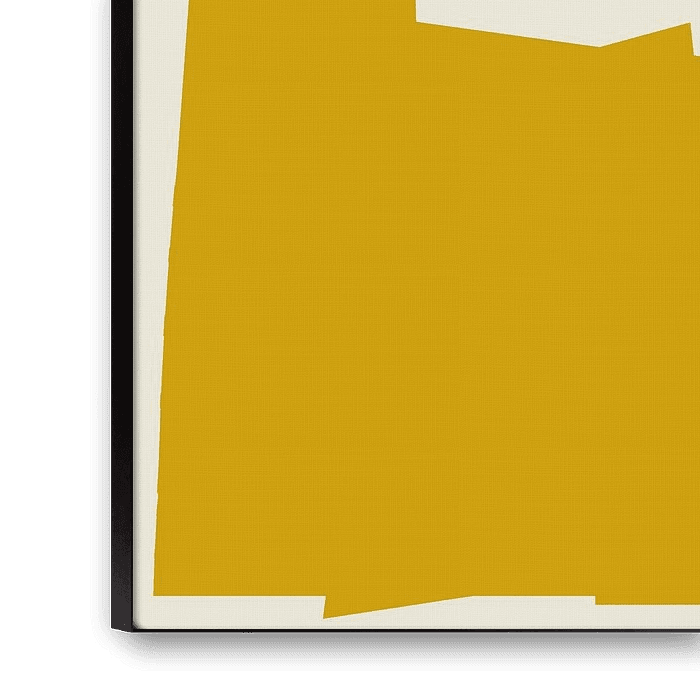 An abstract and Mid Century Modern painting in neutral beige, black and gold yellow Scandinavian style. A soothing abstraction with geometric shapes and rainbow to relax.