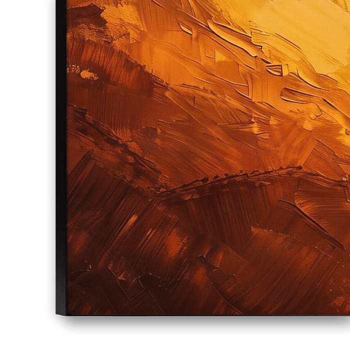 This abstract artwork captures the beauty of a sunrise over a mountainous landscape and radiates an atmosphere of tranquillity. Golden hues permeate the painting as the rising sun gently illuminates the contours of the mountains. The abstract shapes and lines lend the scene a mystical quality that invites the viewer to immerse themselves in a world of serenity. The combination of radiant colours and the tranquil depiction of nature creates a harmonious balance that captures the beauty and majesty of the moment.