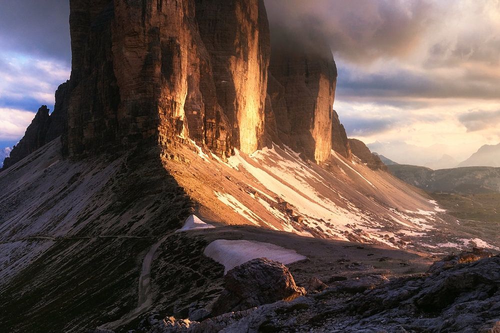 Buy this landscape artwork Golden sunset at the Three Peaks by Daniel Gastager on canvas, ArtFrame, poster and wallpaper, printed on demand in high quality.