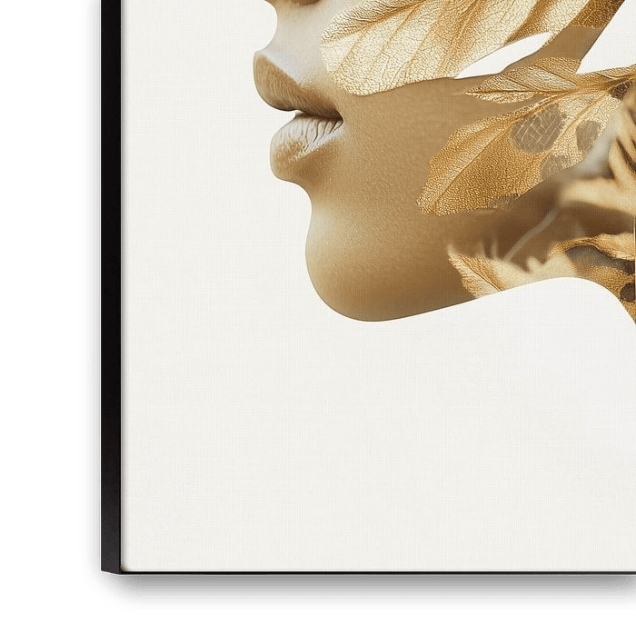enchanting fusion of man and nature, in which a female portrait merges seamlessly with delicate golden leaves. The soft contours of her face exude calm and serenity, while the leaves seem to flow like a natural extension of her thoughts or spiritual essence. The combination of realism and abstraction creates a poetic composition that focuses on transformation, impermanence and harmony with nature.