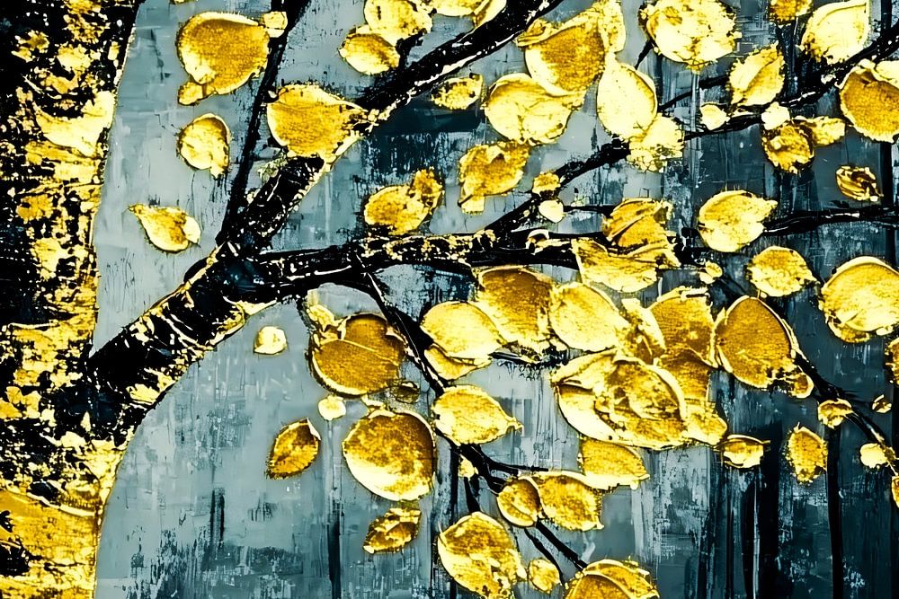 This unique artwork captures attention with a beautiful design of a golden tree full of shiny leaves against a contrasting background of shades of grey and blue accents. The rich play of colours and abstract style make this painting a perfect addition to any modern decor. The design exudes luxury and elegance and can shine in a living room, office or bedroom. The sophisticated gold details add a warm and dynamic feel, while the dark background offers a calming base. Ideal for those who want to create a sophisticated yet striking atmosphere in their home.