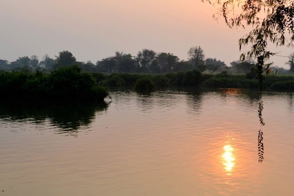 The rays of the setting sun tint the tranquil waters of the Mekong with gold. The sky takes on warm hues, changing from pink to purple, while the river seems to fall asleep under this soothing light. The surrounding nature melts into silence, offering a moment suspended in time.