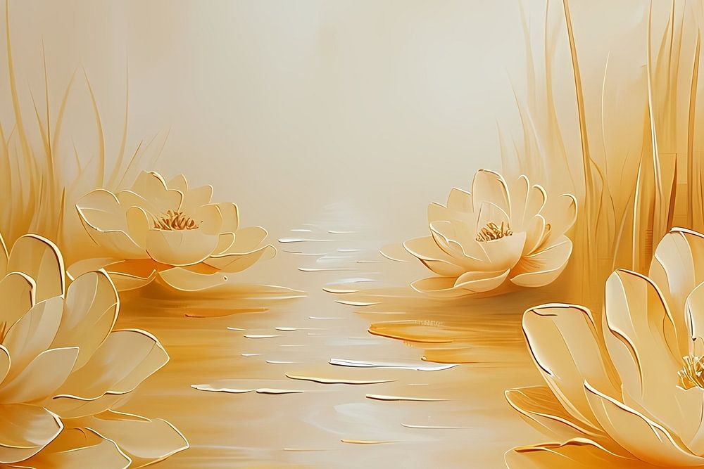 This beautiful design shows delicate water lilies in a serene, golden setting. The soft colours and subtle transition between shades create a sense of tranquillity and elegance. Perfect for any room that needs a touch of nature and sophistication. This artwork exudes timeless beauty, where simplicity and natural elements come together in a harmonious whole. An ideal choice for those who love minimalist and serene decor, it brings a touch of luxury and calm to your interior. Ideal for living rooms, bedrooms or dining rooms.