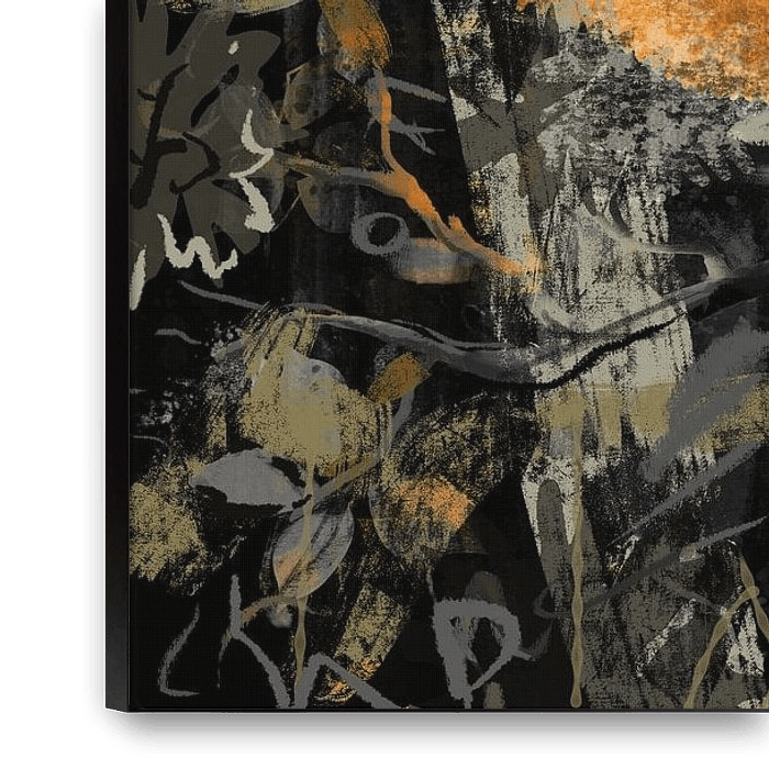 Buy this abstract artwork Golden yellow chameleon in black jungle by Emiel de Lange on canvas, ArtFrame, poster and wallpaper, printed on demand in high quality.