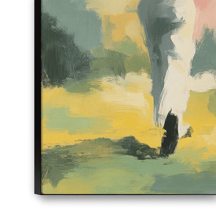 A golfer in yellow and white with a black hat plays in the park, surrounded by lush green grass. Painted in a vintage oil style, the work captivates with its soft pastel colours, expressive brushstrokes and visible textures. The composition conveys elegance, calm and movement at the same time. The details and harmonious colour palette artistically capture the moment of the game and lend the scene depth and vibrancy.
