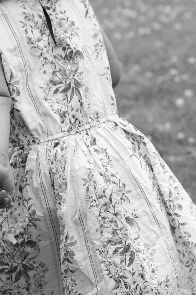 A candid black and white capture of a toddler playing outdoors in a flowered dress. The image evokes a sense of nostalgia and quiet reminiscence — a fleeting moment of childhood freedom, preserved in soft tones and timeless light.