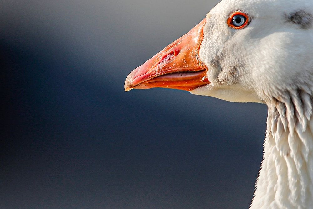 The most striking feature of this goose is undoubtedly its eyes. They stand out like jewels, due to the perfect combination of the soft evening light and the subtle orange hues visible in its head. The goose seems to attract the viewer's attention, so to speak, with these hypnotic colours.