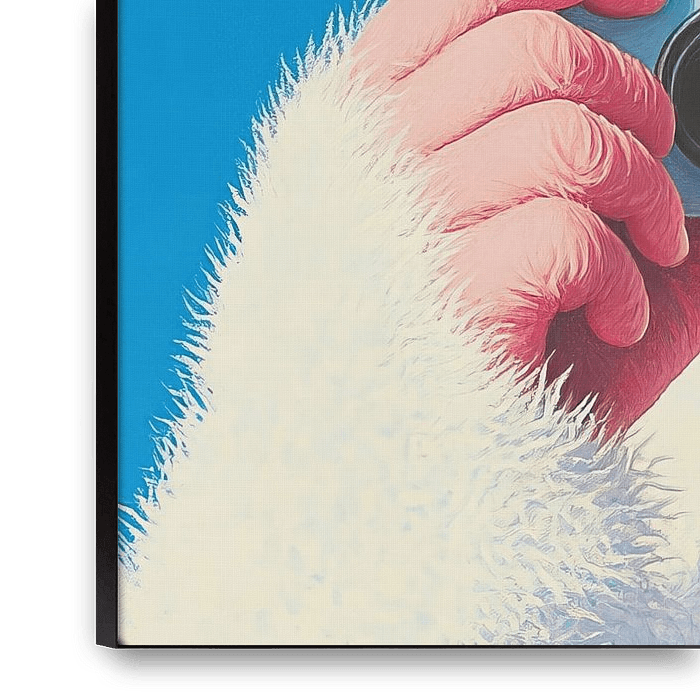 Gorilla | Say Cheese, Mr. Gorilla - This animal painting appears to be a portrait of an expressive white gorilla, accessorised with sunglasses, holding a camera against an intense blue sky, captured in a humorous, almost human pose.
