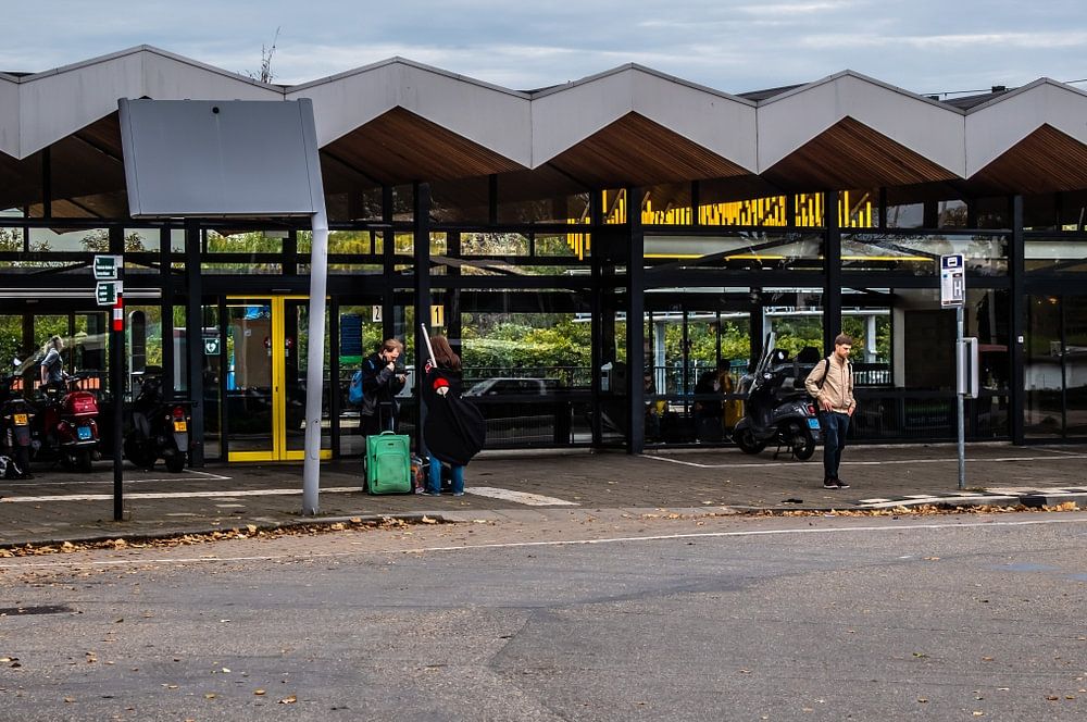 Gorinchem station (b.y. 1971) with its distinctive classic folding roof, station clock and yellow dustbin, photographed in the autumn of 2021.