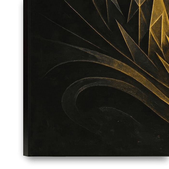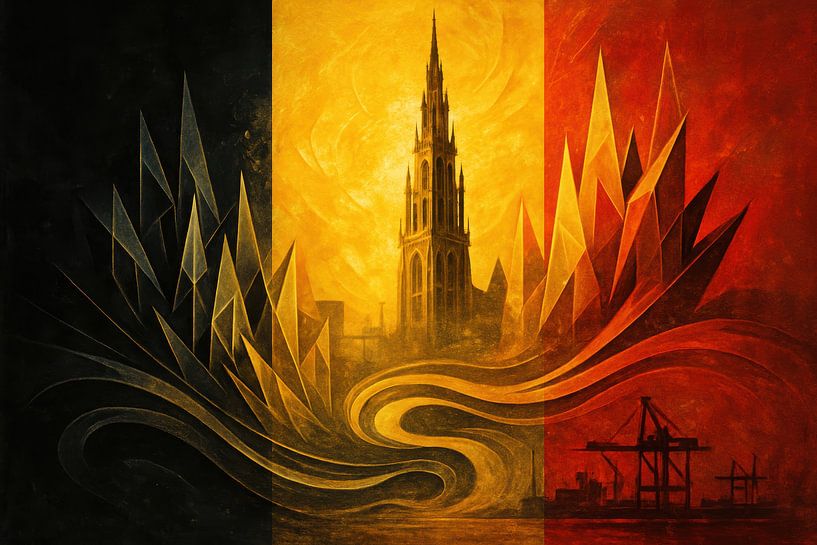 A slender cathedral rises between geometric points, while harbour cranes guard the horizon. Warm flag colours blend together, creating a glow that contrasts with dark accents. Undulating lines and sharp shapes give rhythm and depth to the city skyline. The composition balances calm and dynamism: a tranquil waterline at the bottom,…
