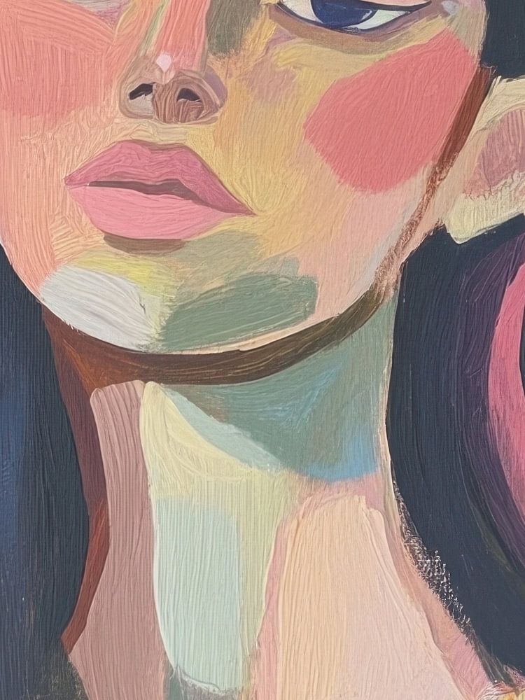 A powerful hippie-style portrait of a woman, in Henri Matisse style with gouache paint. Soft colours.