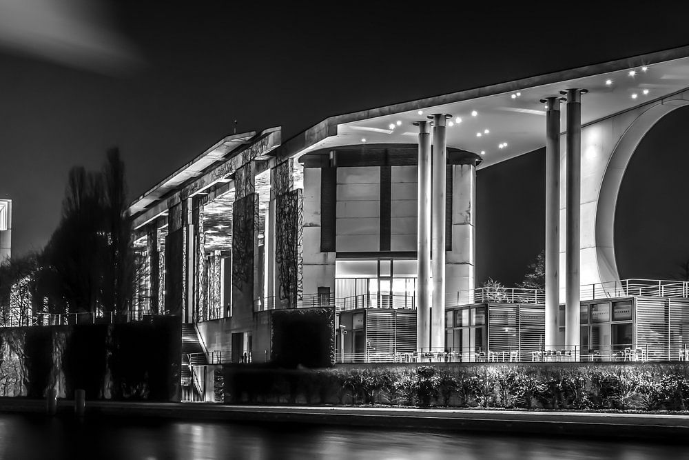 Very stylish, the buildings of the government district and the shining Spree in Berlin at night