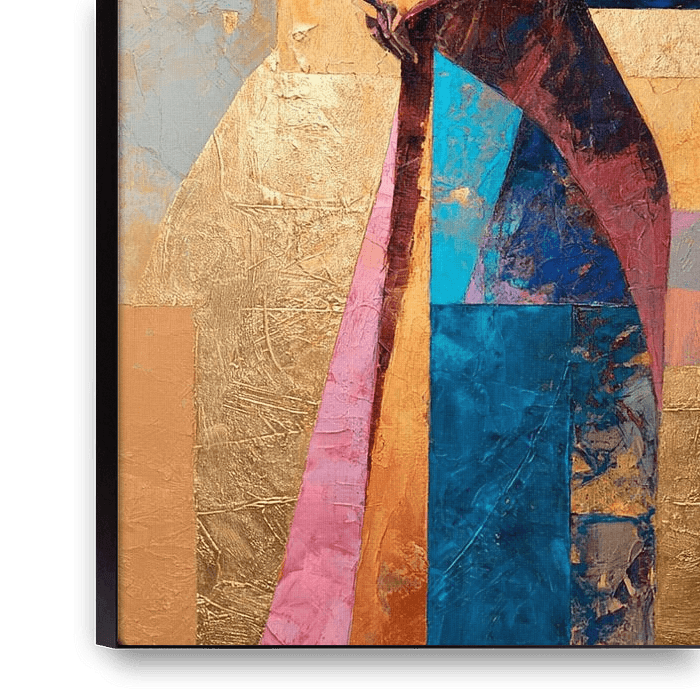 This artwork portrays a lady through an abstract modern painting style, where realism gives way to emotion, movement, and imagination. Instead of clearly defined features, the woman’s form is expressed through fluid brushstrokes, geometric patterns, and bold color contrasts. Shades of warm gold symbolize grace and confidence, while deep…
