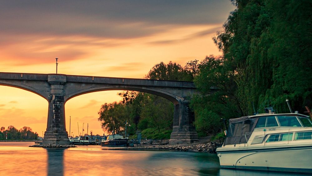 Buy this landscape artwork Grafenwerth Bridge by Jens Unglaube on canvas, ArtFrame, poster and wallpaper, printed on demand in high quality.