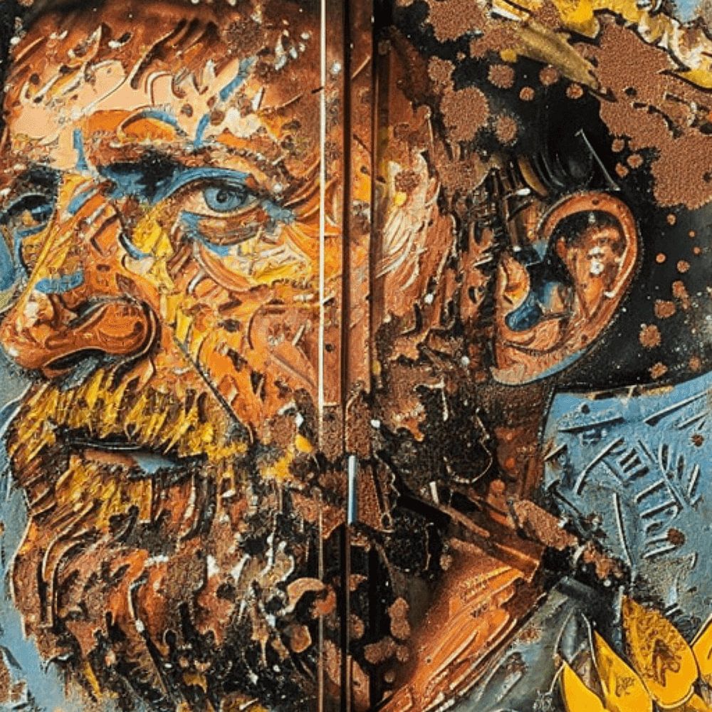 An expressive street art portrait, painted on rusted metal doors, shows a man with a beard, who you might call Vincent, and a straw hat, surrounded by bright yellow sunflowers. The colours are intense, with shades of blue and orange that flow into each other and are complemented by the texture of the rust. The style is reminiscent of an impressionistic approach, with visible brushstrokes and a vibrant choice of colours. The man's face is striking, with a thoughtful expression. The combination of the portrait, the sunflowers and the industrial background creates a unique and powerful effect.