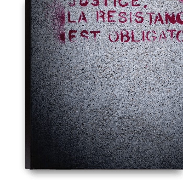 Colourful graffiti adorns a wall, with words expressing justice and resistance. The letters and shapes stand out thanks to their vibrant colours and dynamic lines, while the background of the wall remains blurred. The composition draws attention to the message and creates a sense of power and engagement with social issues.