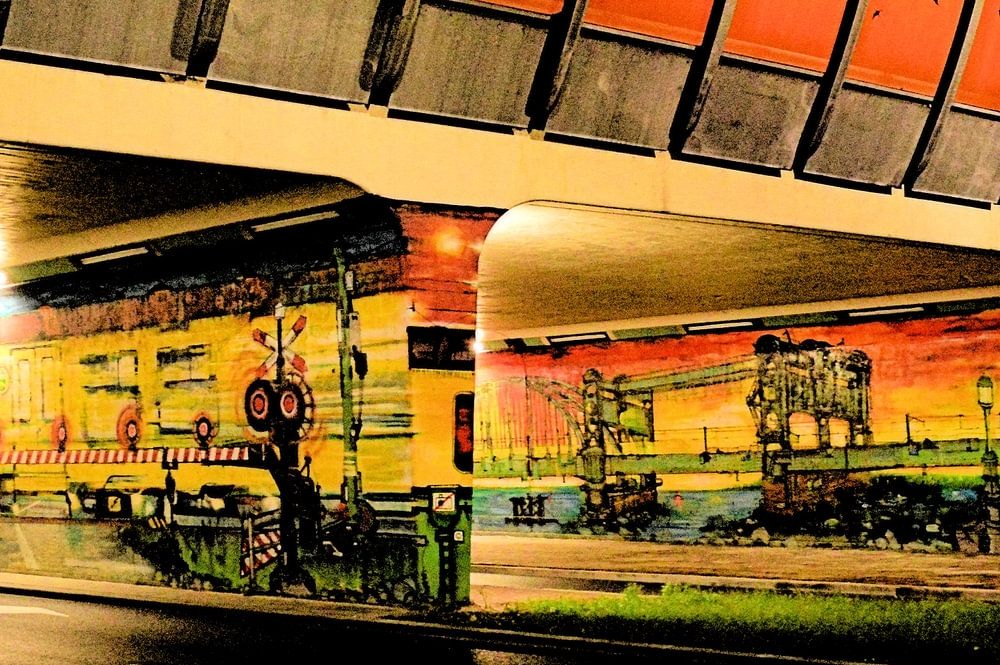 Digital art. Graffiti on the pillars of a viaduct