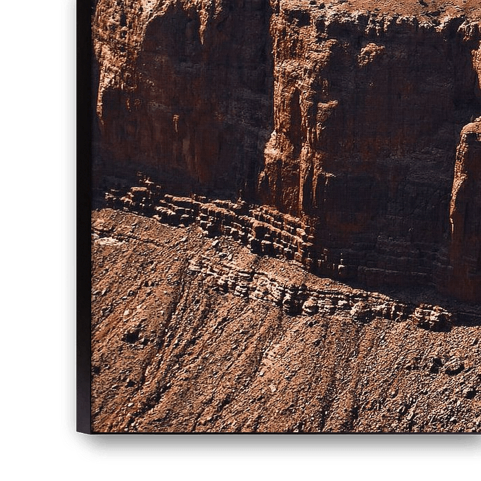 A detailed piece of the Grand Canyon in the USA. In the background you can see the hairpin bends of the "Unkar Creek Rapids" of the Colorado River. This picture shows you the rough structures of mountain / rock with earthy colors. The composition consists of a diagonal image with great depth.