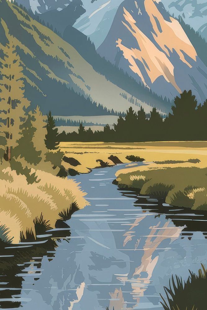 Majestic mountains rise up in front of a calm river that reflects the surrounding nature. The harmonious colours and stylised depiction evoke a sense of adventure and security at the same time. Perfect for the living room, this work of art invites you to indulge in daydreams and savour the beauty of nature.