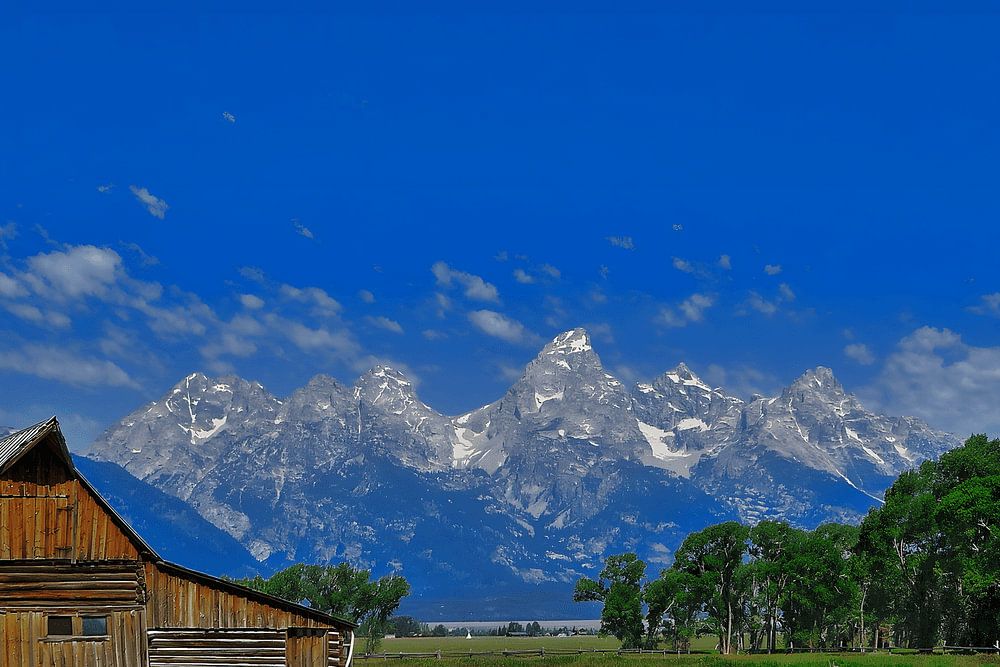 The wooden building in the foreground is a historic barn, probably part of the so-called Moulton Barns. These barns are one of the most photographed buildings in the American West and are located in the area known as Mormon Row. Mormon Row was inhabited by Mormon pioneers in the 1890s, who built farms and worked the land.