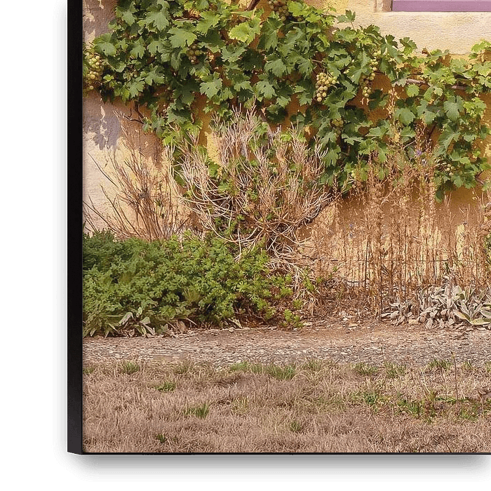 Yellow plastered wall in a French village, overgrown with grapevines. A window with purple frames and a purple wooden door catch the warm summer light.