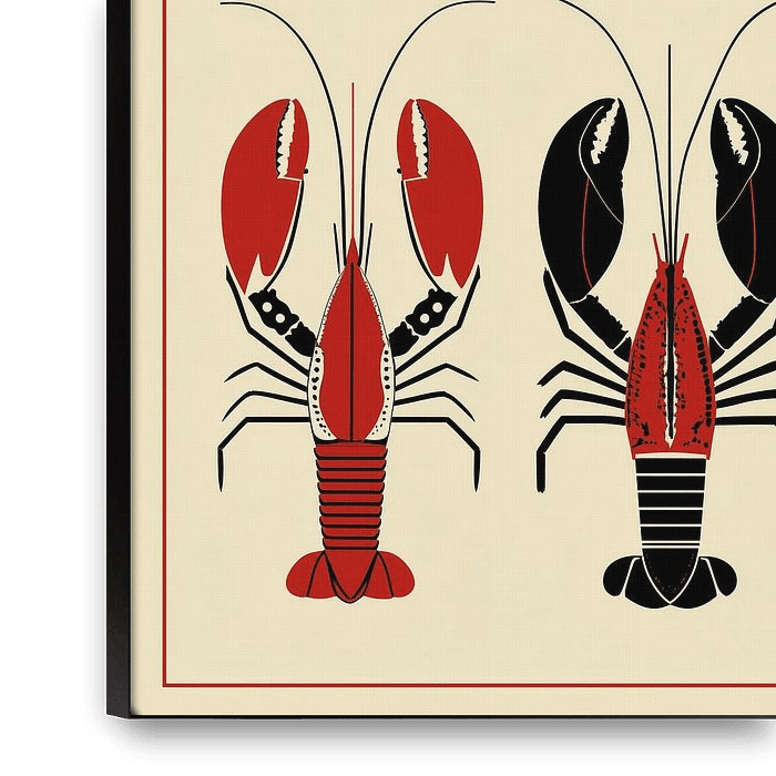 This striking graphic print featuring lobsters is a real eye-catcher for the kitchen. Six lobsters are presented symmetrically in a sleek and modern interplay of lines, executed in powerful shades of red, black and cream. The combination of repetition and subtle variation in patterns gives the work a rhythmic and decorative…